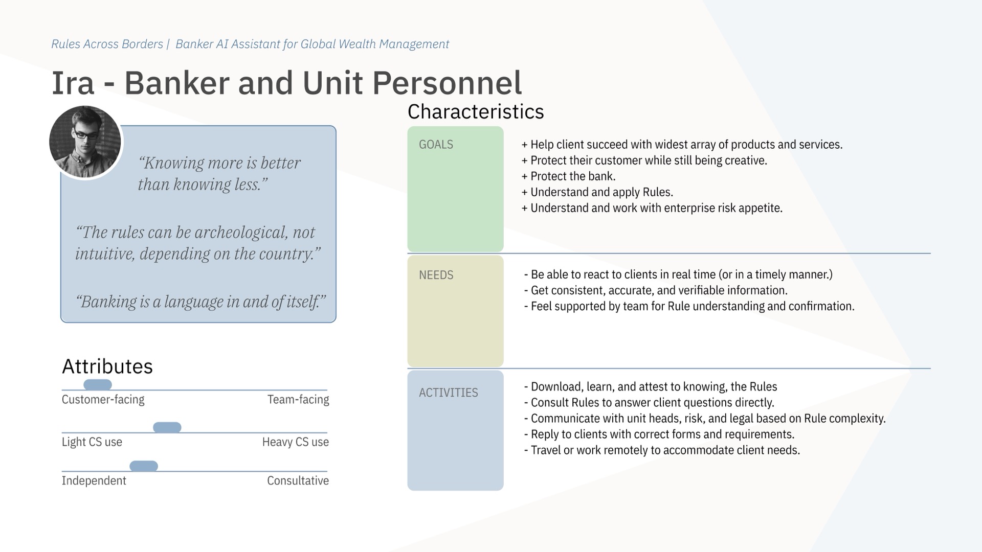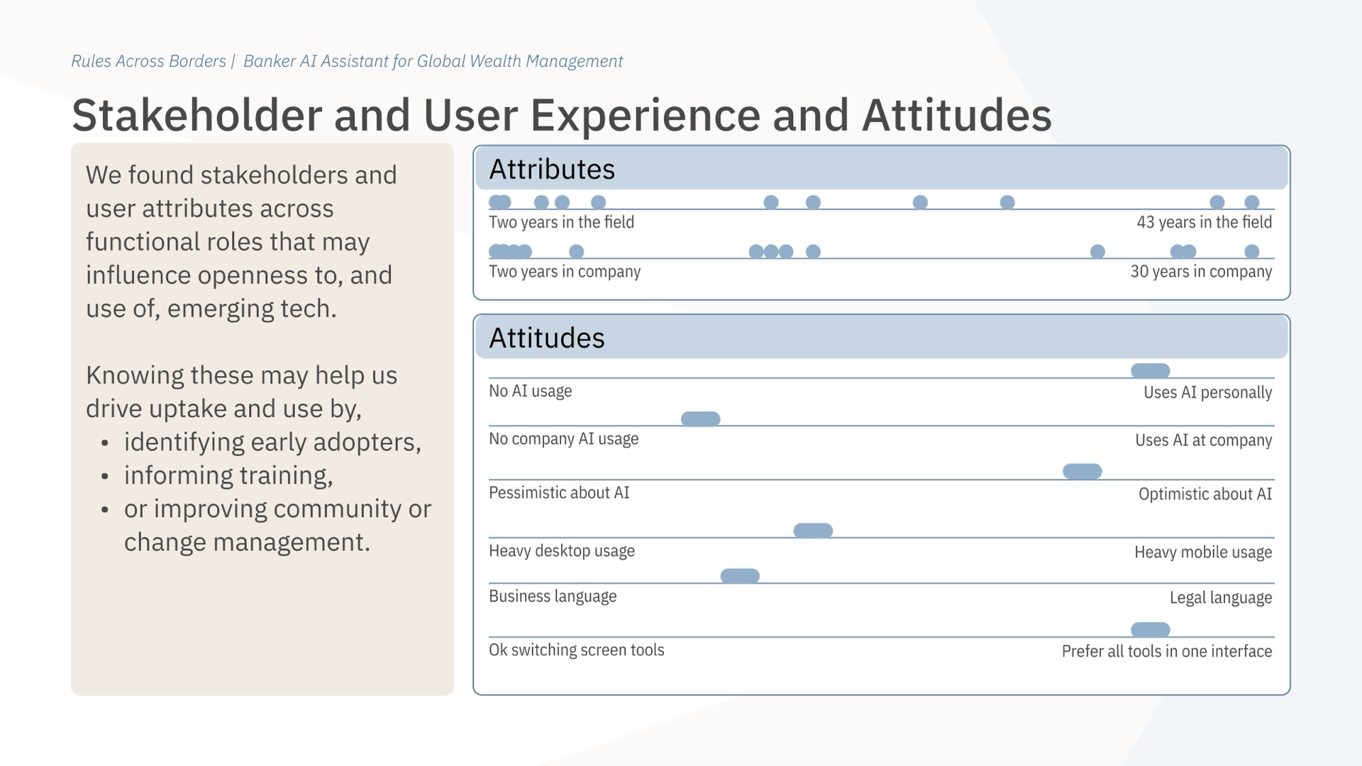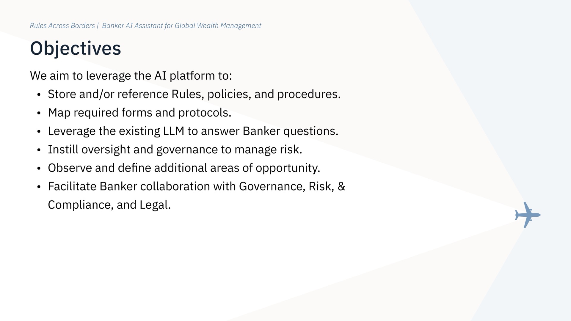 Cross-border wealth advisors, high net worth clients, AI pilot team, business intelligence team, legal, risk, compliance teams.