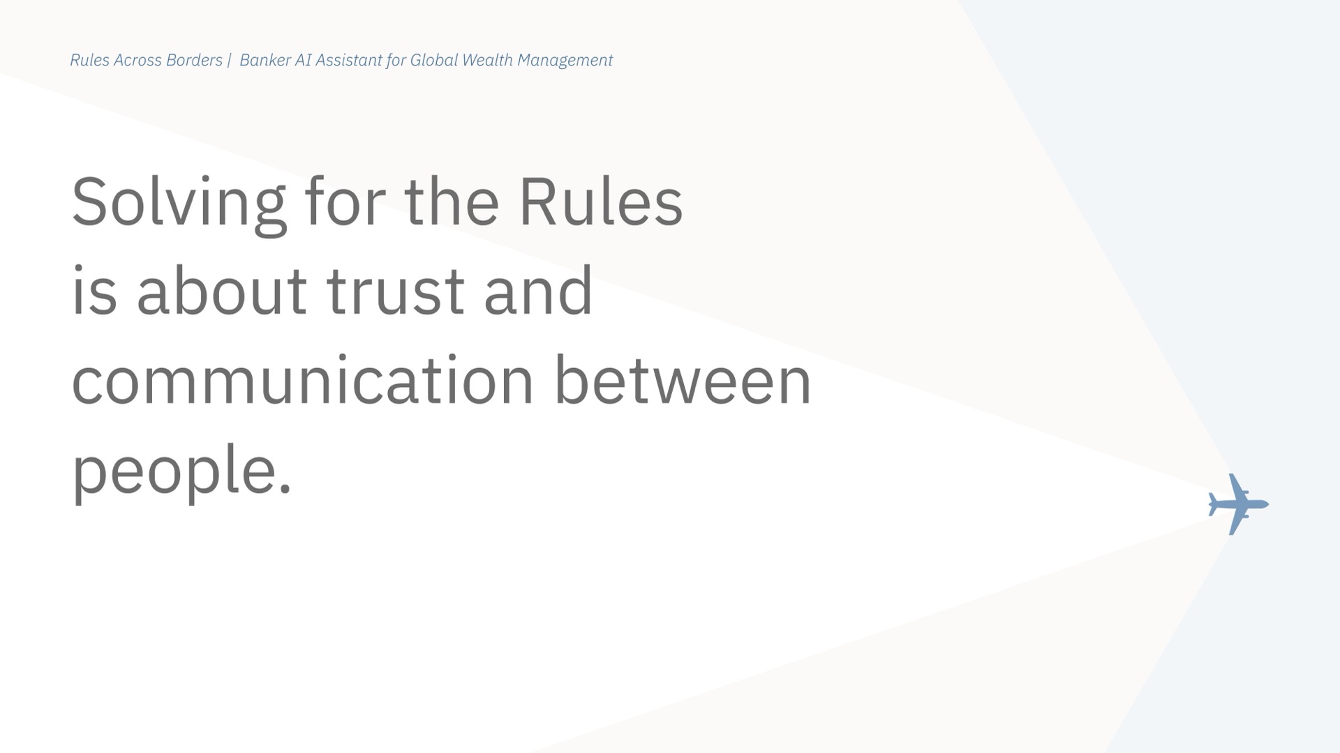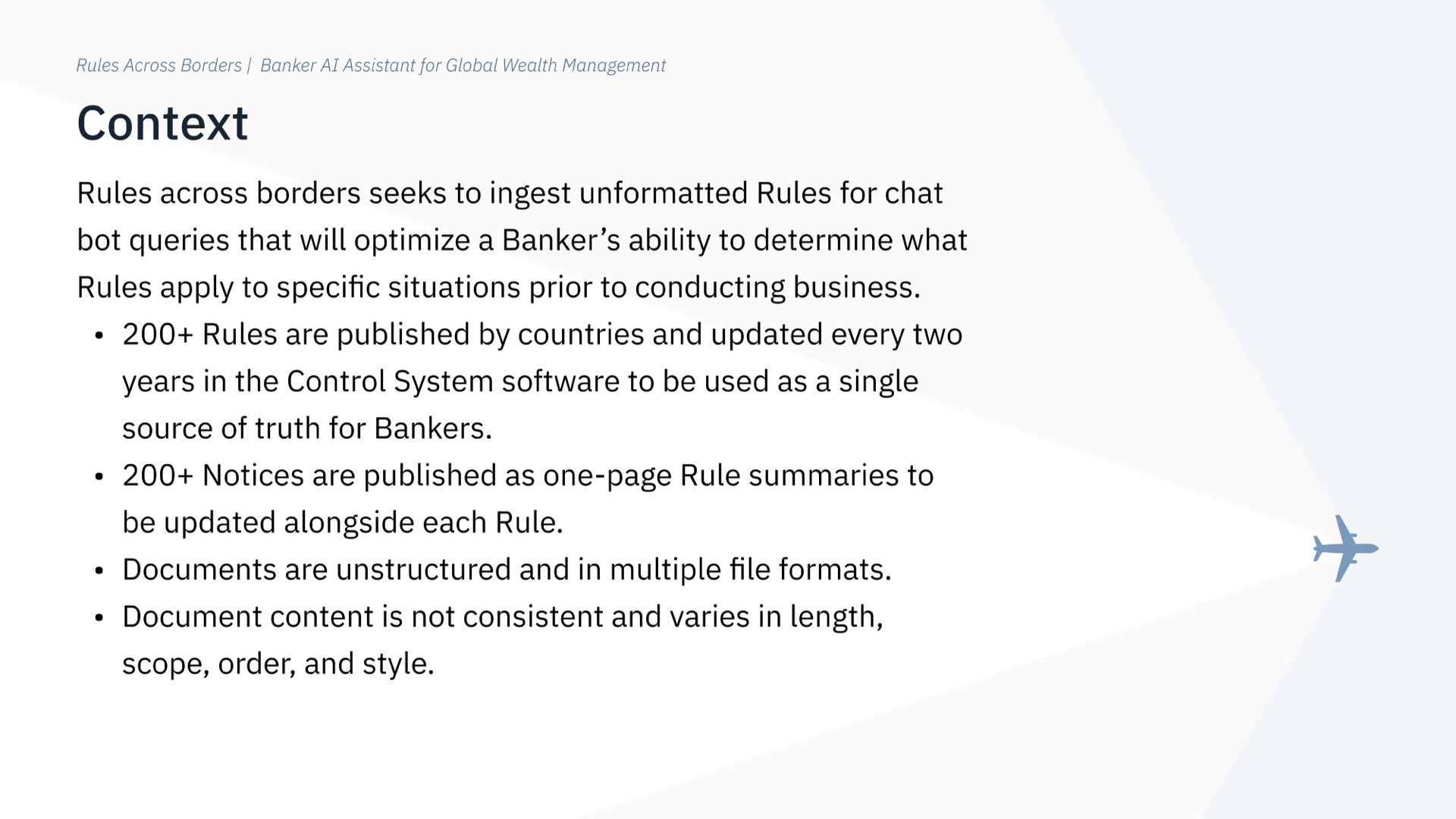 Rules across borders seeks to ingest thousands of unformatted Cross Border Rules. Documents are cataloged across several libraries and digital formats influding documents, spreadsheets, and presentations. The AI intervention aims to allow chat bot queries to optimize a Banker ’s ability to determine what Rules apply to specific situations prior to conducting business. 200+ Rules are published by countries and updated every two years in Control System software that is independently administered by three global regional entities. The AI Assitant will consolidate rules and alert to errors and updates to provide a single source of truth for Bankers.