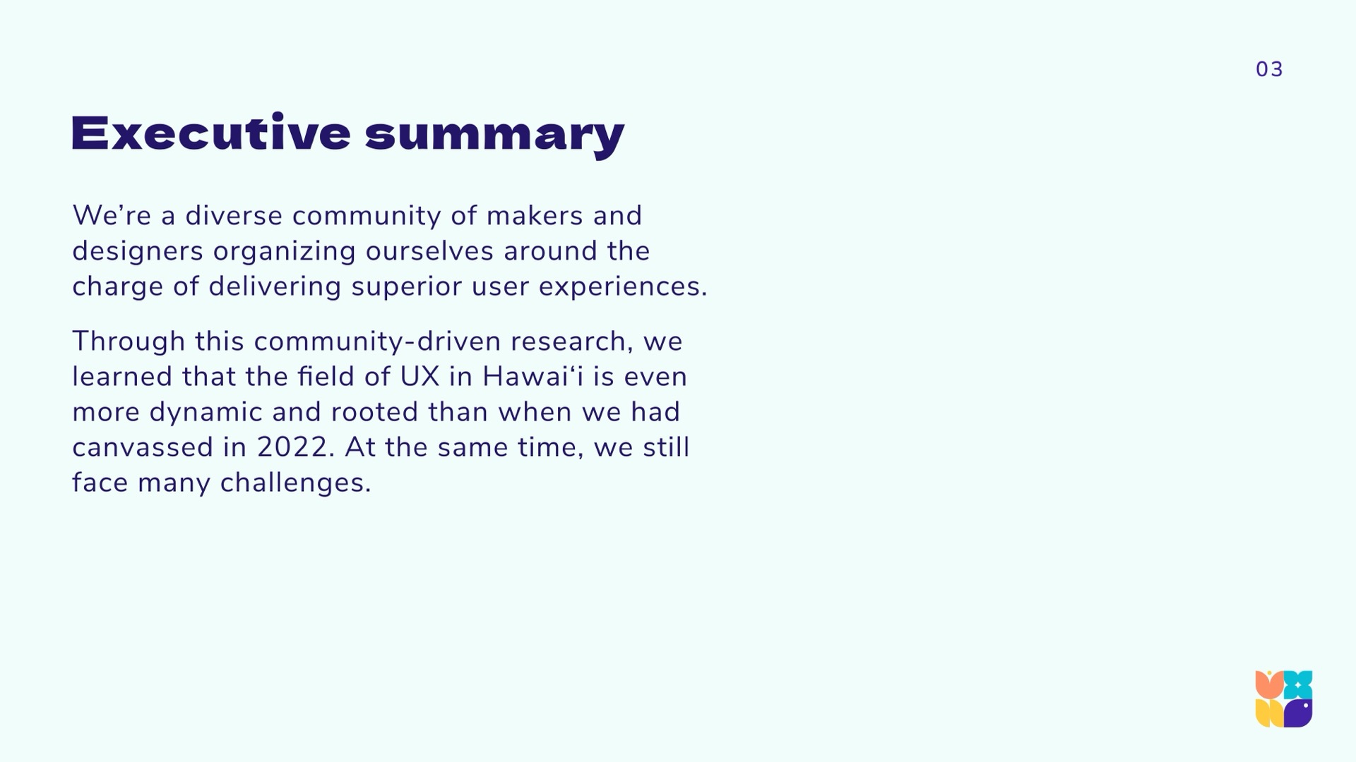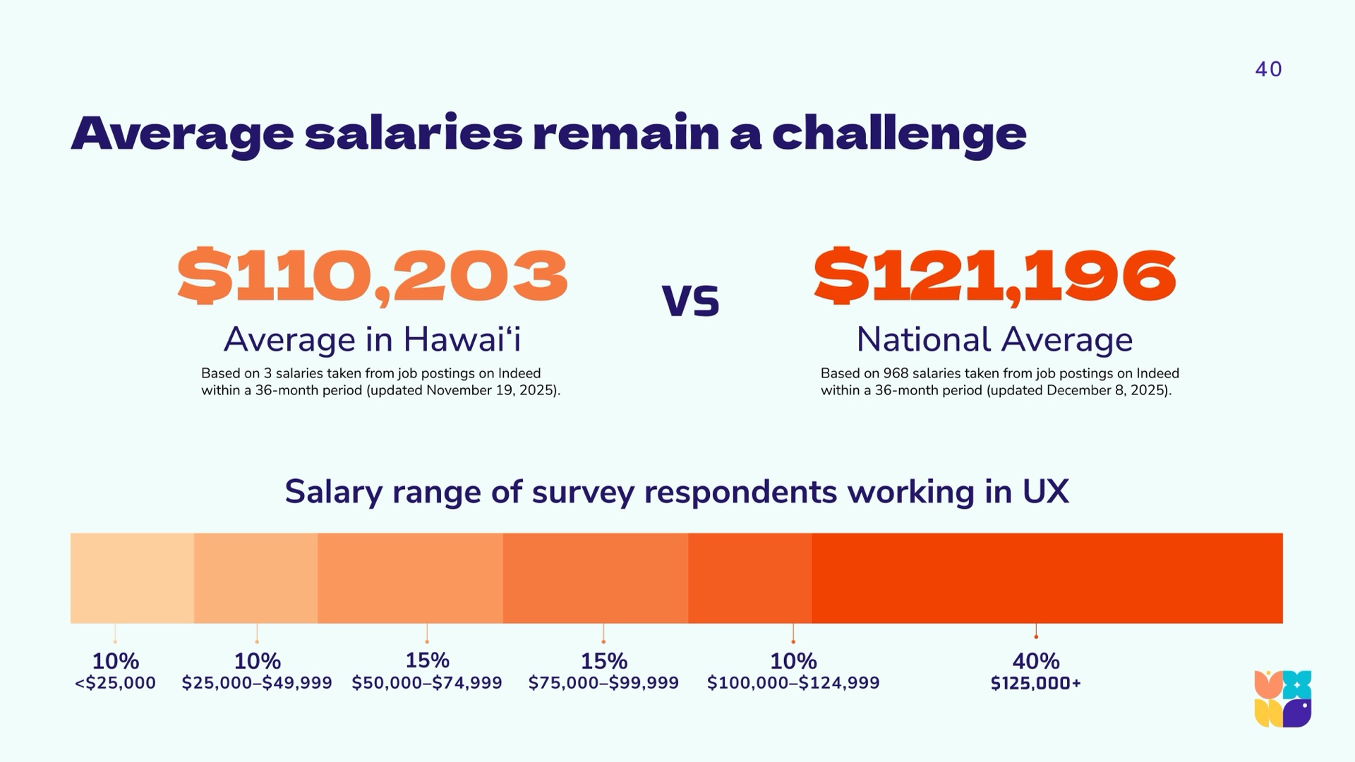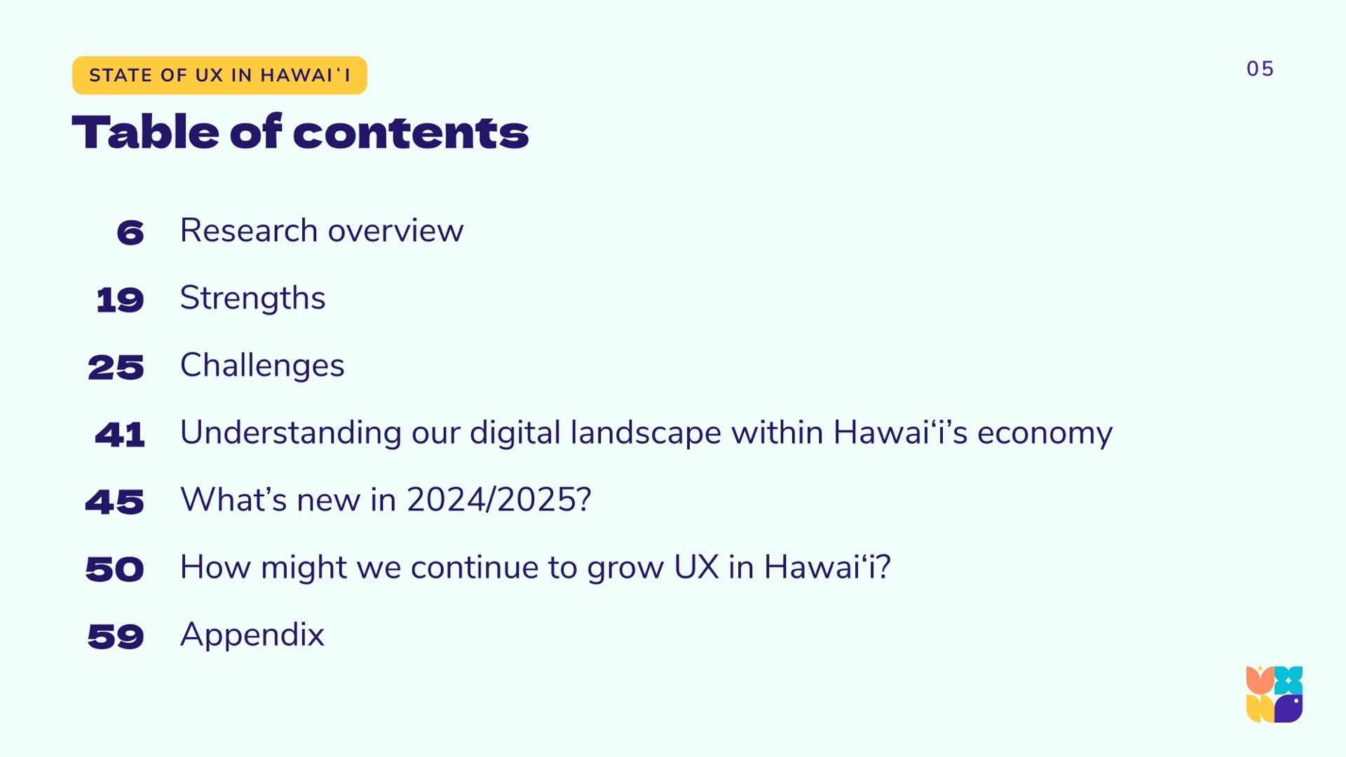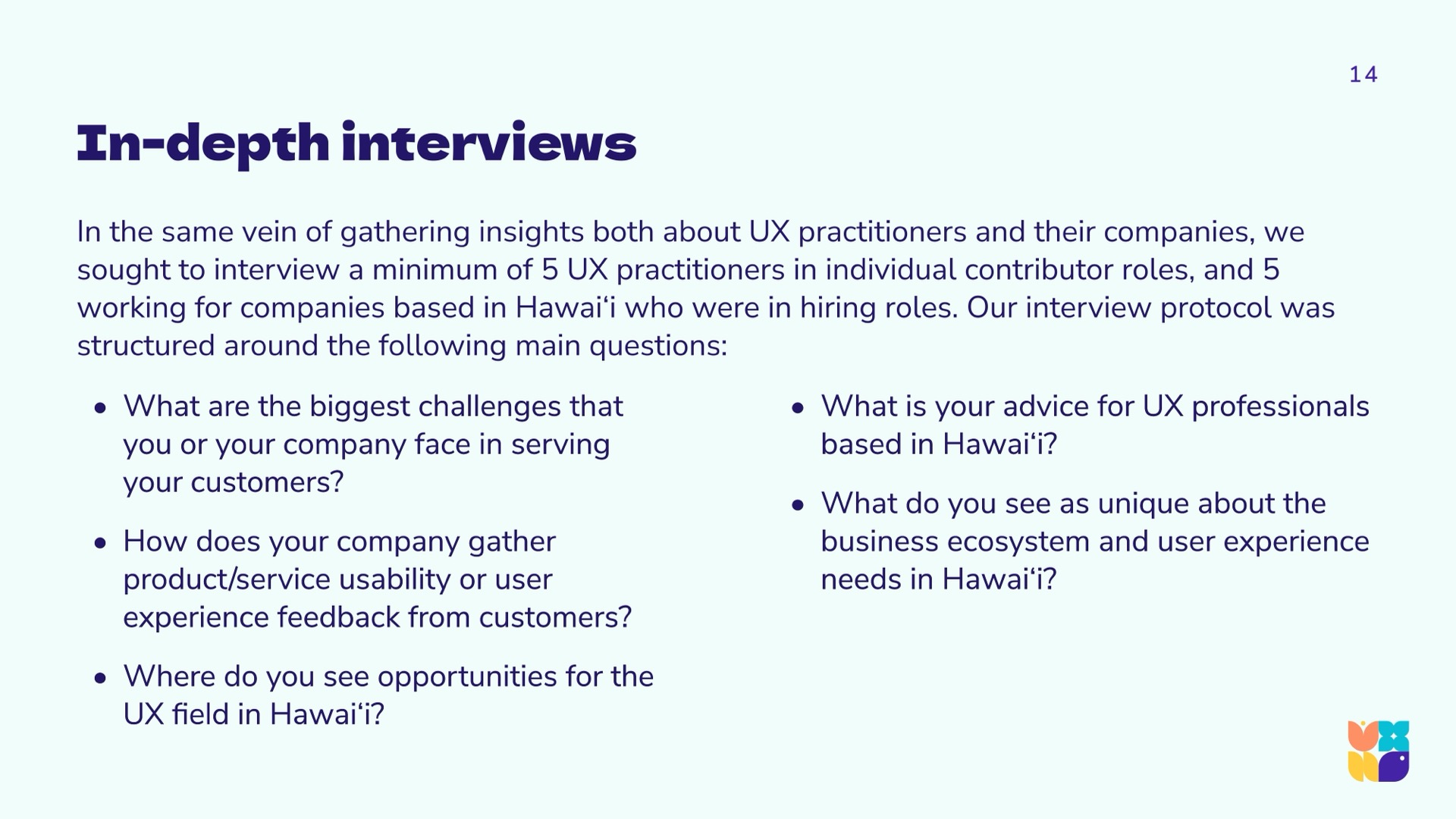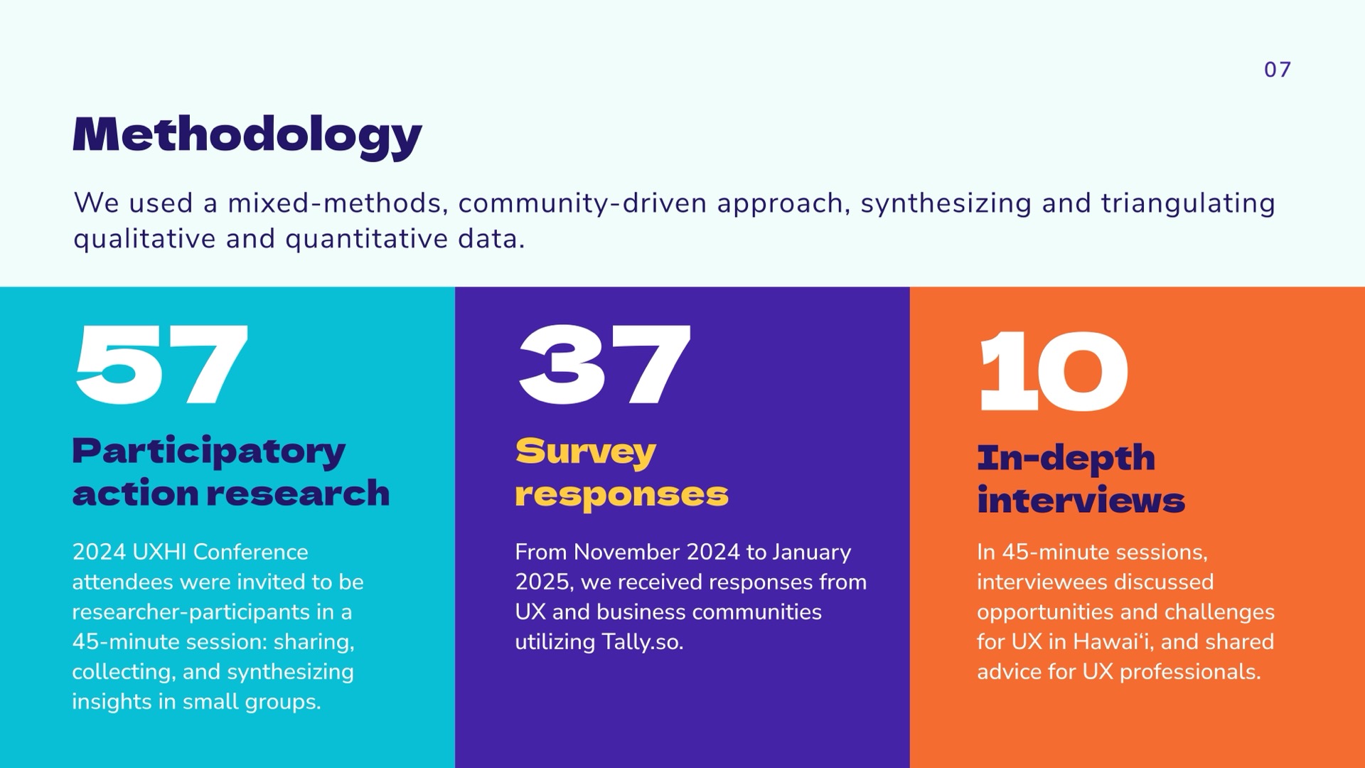To arrive at a holistic picture of the state of UX in Hawaiʻi, the research team used a community-driven mixed-methods approach, synthesizing and triangulating qualitative and quantitative data. We aimed to hear from across industries and sectors, as the previous 2022 report was largely self-reflective within the design community. Using LinkedIn, personal networks, and open calls during technology and innovation events, we gathered a spectrum of viewpoints from around the islands and abroad.
