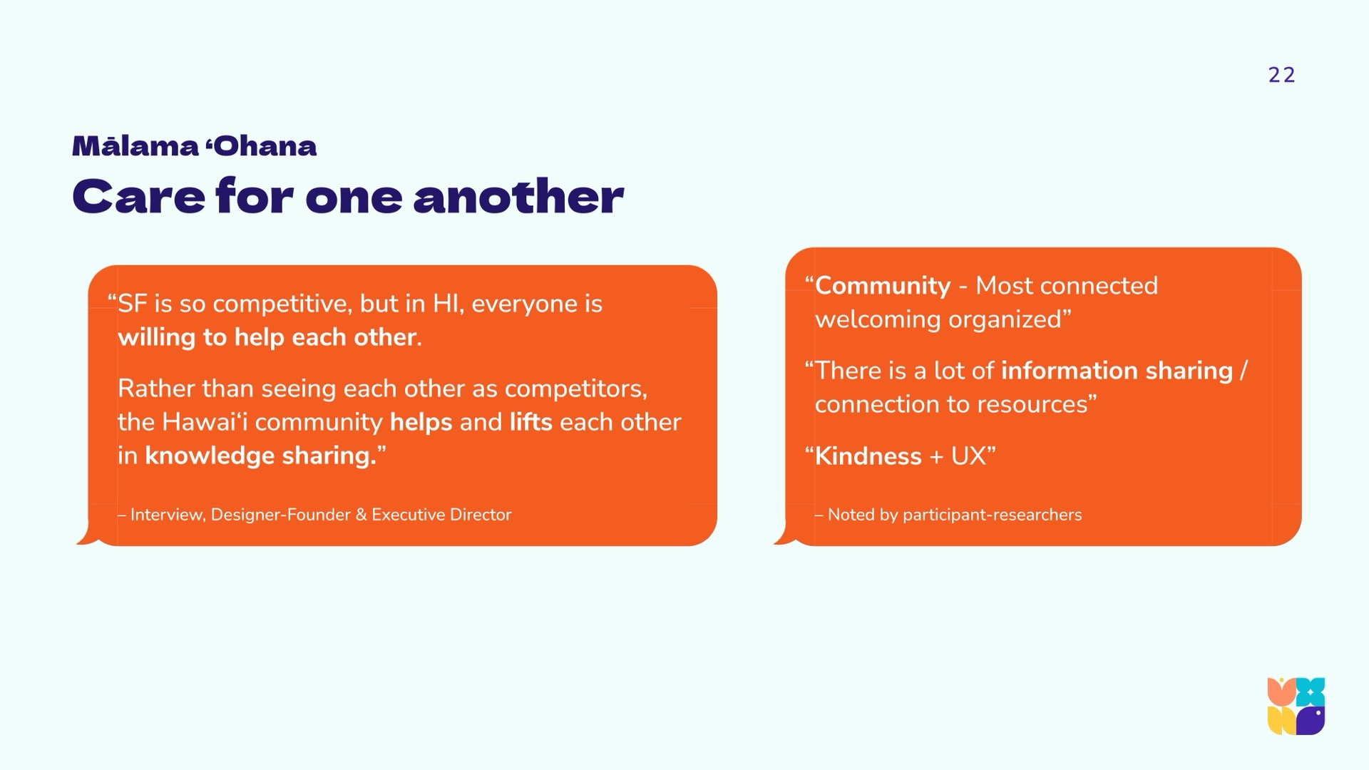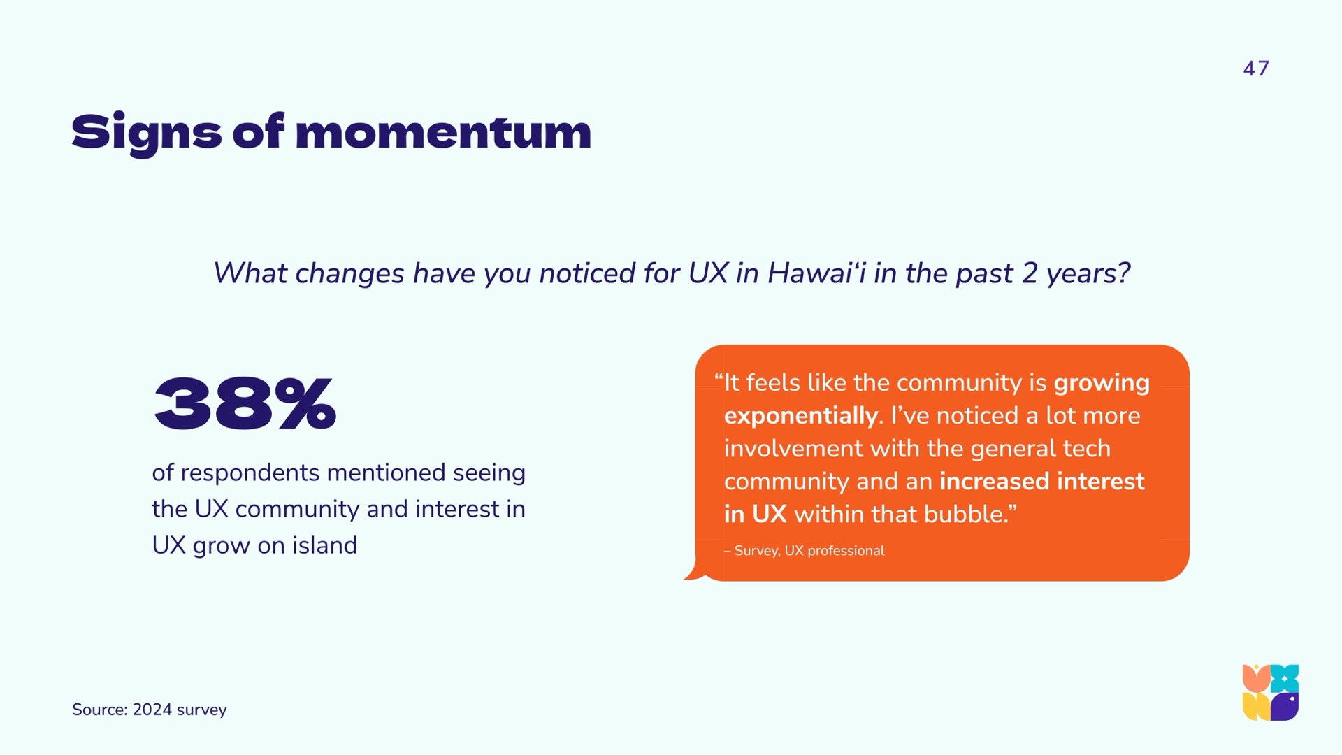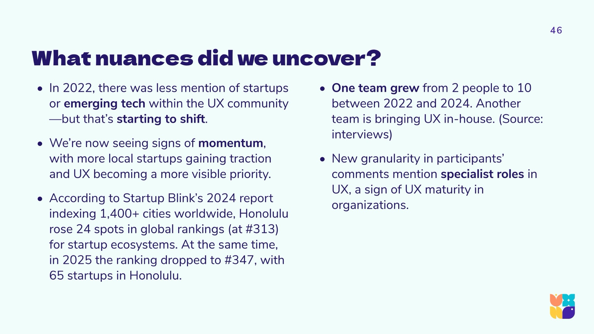 In synthesizing the data, the research team learned that the same aspects that limit technology, design, and UX innovation horizons in Hawaiʻi, are the very aspects that may be recognized as our unique gifts. This repositions the conversation to celebrate our cultural gifts, our geographic neutrality, and our uncommon talent pools. The UXHI research team arrived at community calls to action that will strengthen and further differentiate the community as a significant player in a global market.