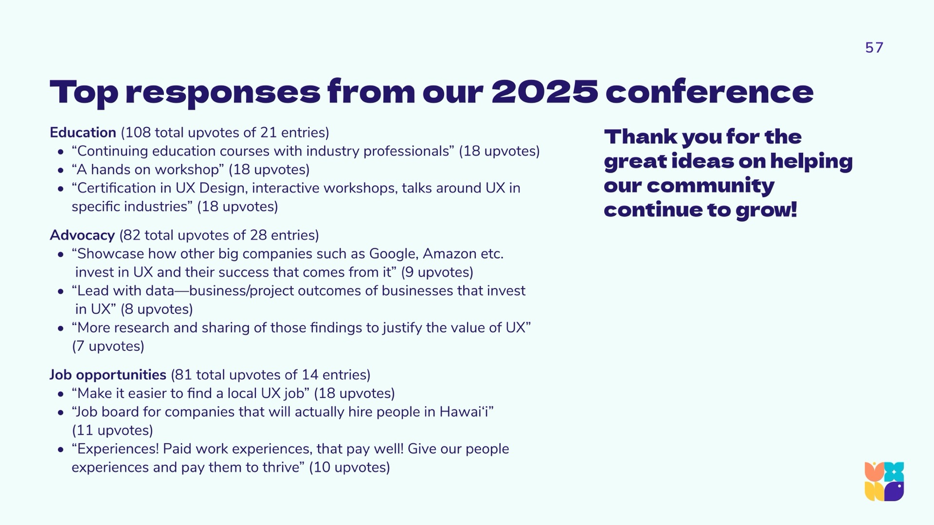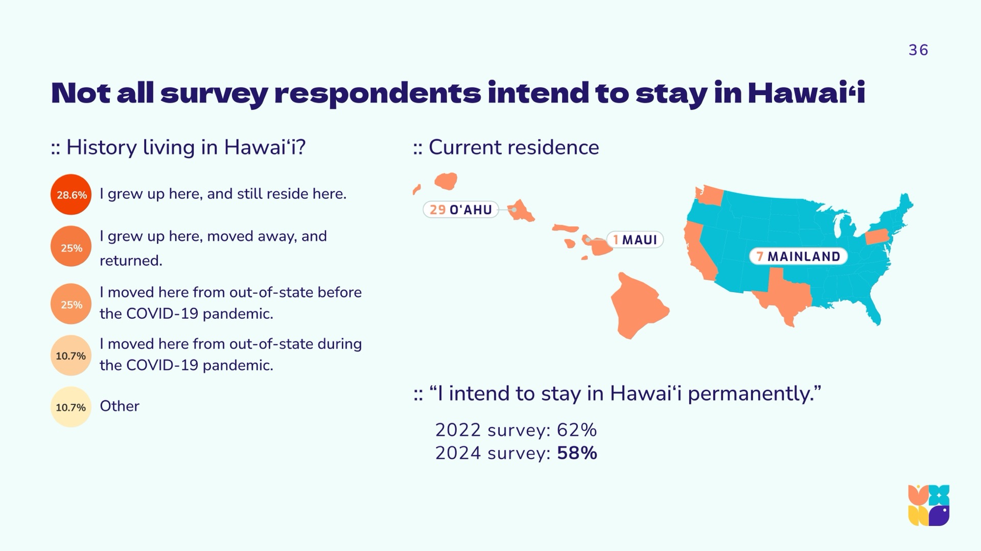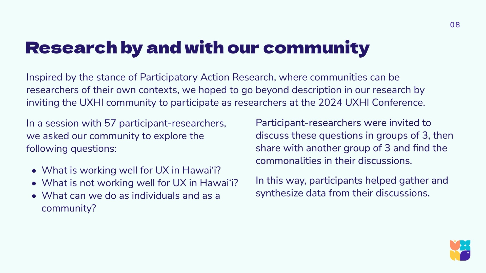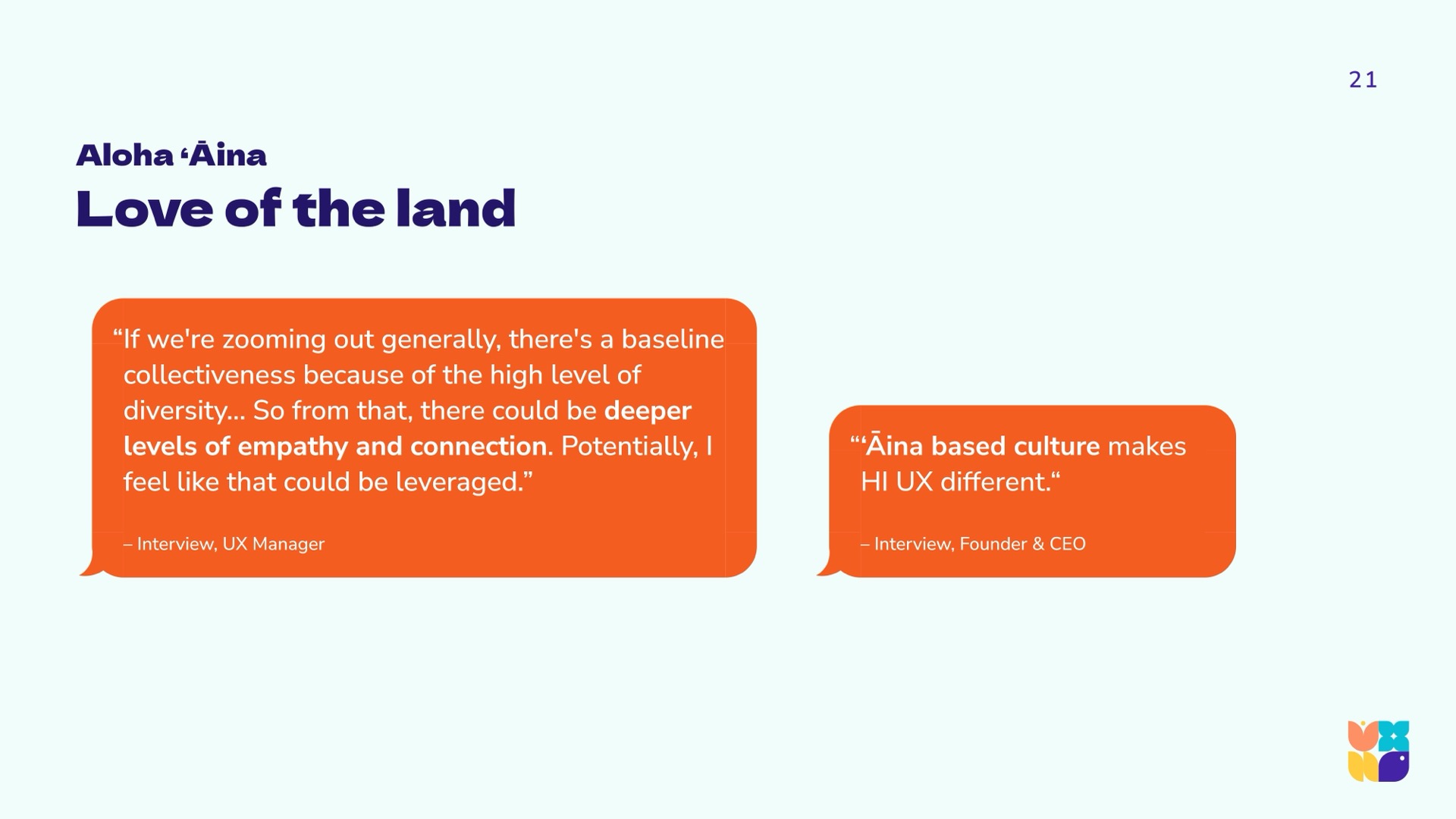 In synthesizing the data, the research team learned that the same aspects that limit technology, design, and UX innovation horizons in Hawaiʻi, are the very aspects that may be recognized as our unique gifts. This repositions the conversation to celebrate our cultural gifts, our geographic neutrality, and our uncommon talent pools. The UXHI research team arrived at community calls to action that will strengthen and further differentiate the community as a significant player in a global market.