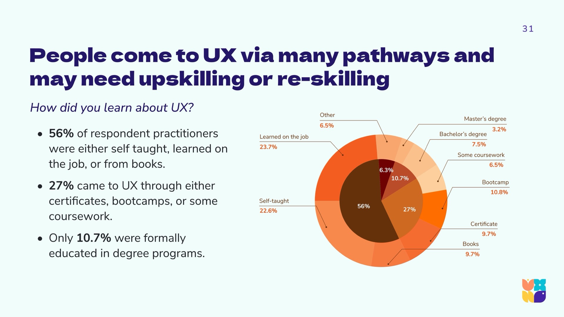 - Create and publish stories of individual pathways to UX.